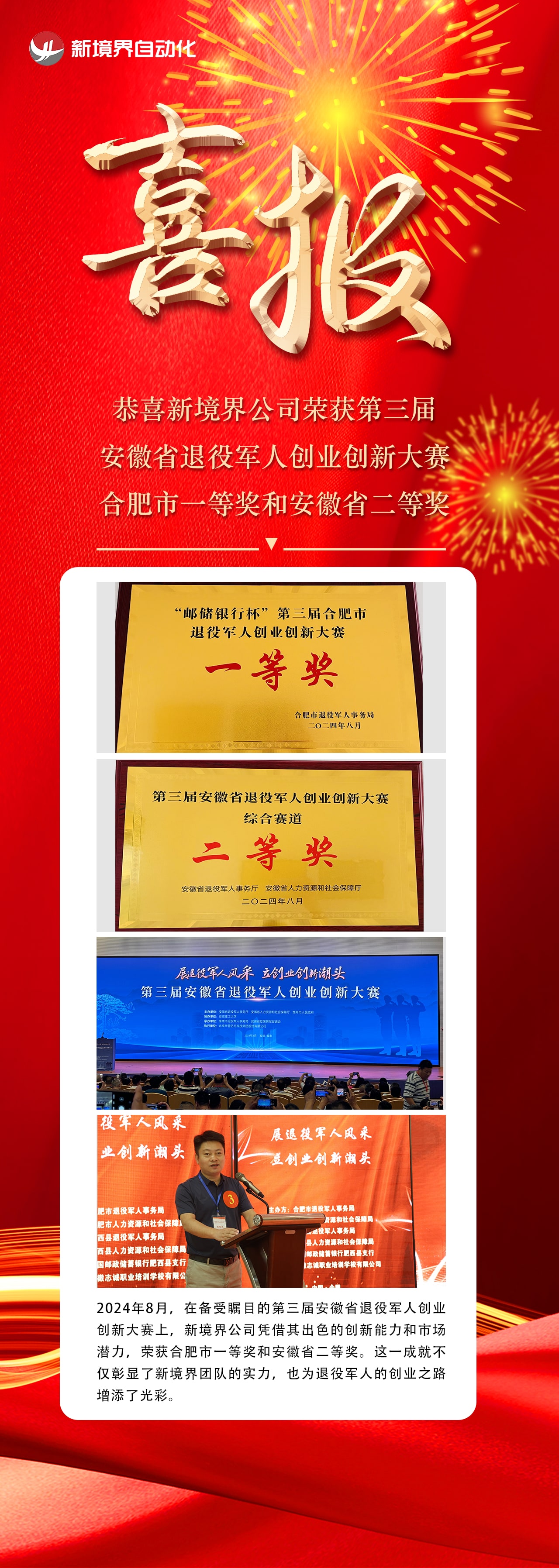 恭喜新境界公司榮獲第三屆安徽省退役軍人創業創新大賽合肥市一等獎和安徽省二等獎